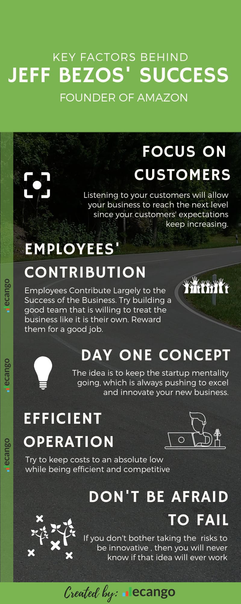 Not so long after Amazon was launched, Jeff Bezos came up with the "Day 1 concept". The Day 1 concept means that the company is always in its initial startup phase. The idea is to keep the startup mentality going, which is always pushing to excel and innovate your new business. Amazon is always evolving by trying out new ways to be more productive on a lower budget and new ways of creating more business opportunities.