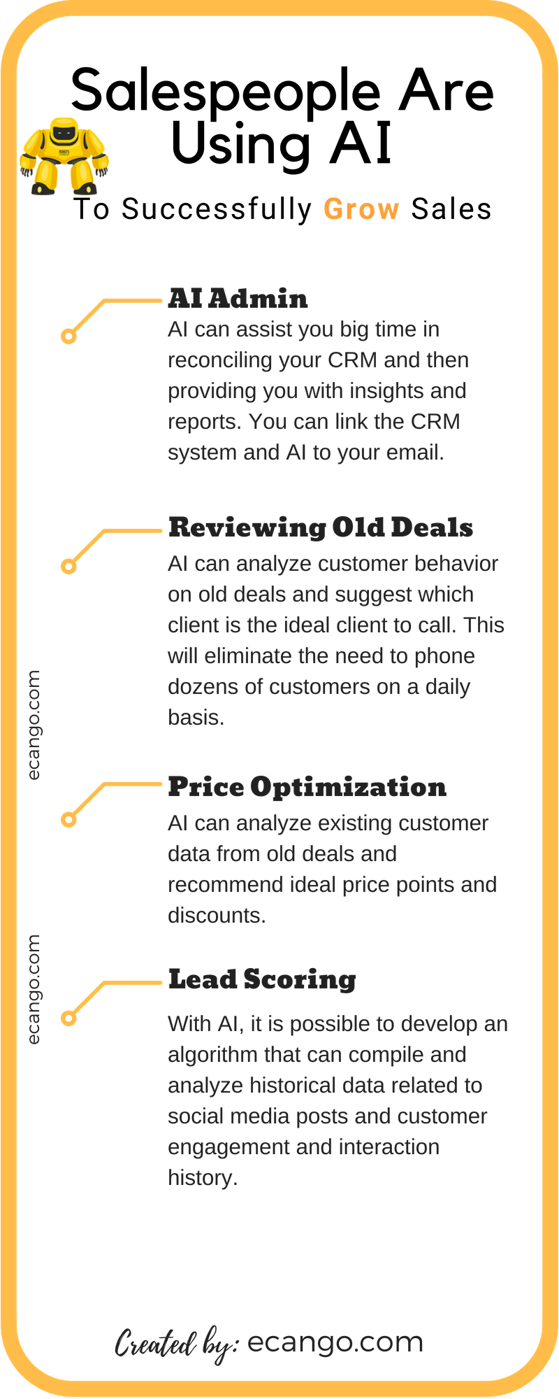In this case, it can be possible for AI to form estimate predictions of when a customer will be ready to make a purchase. AI can assist in updating a client's status in the sales pipeline.