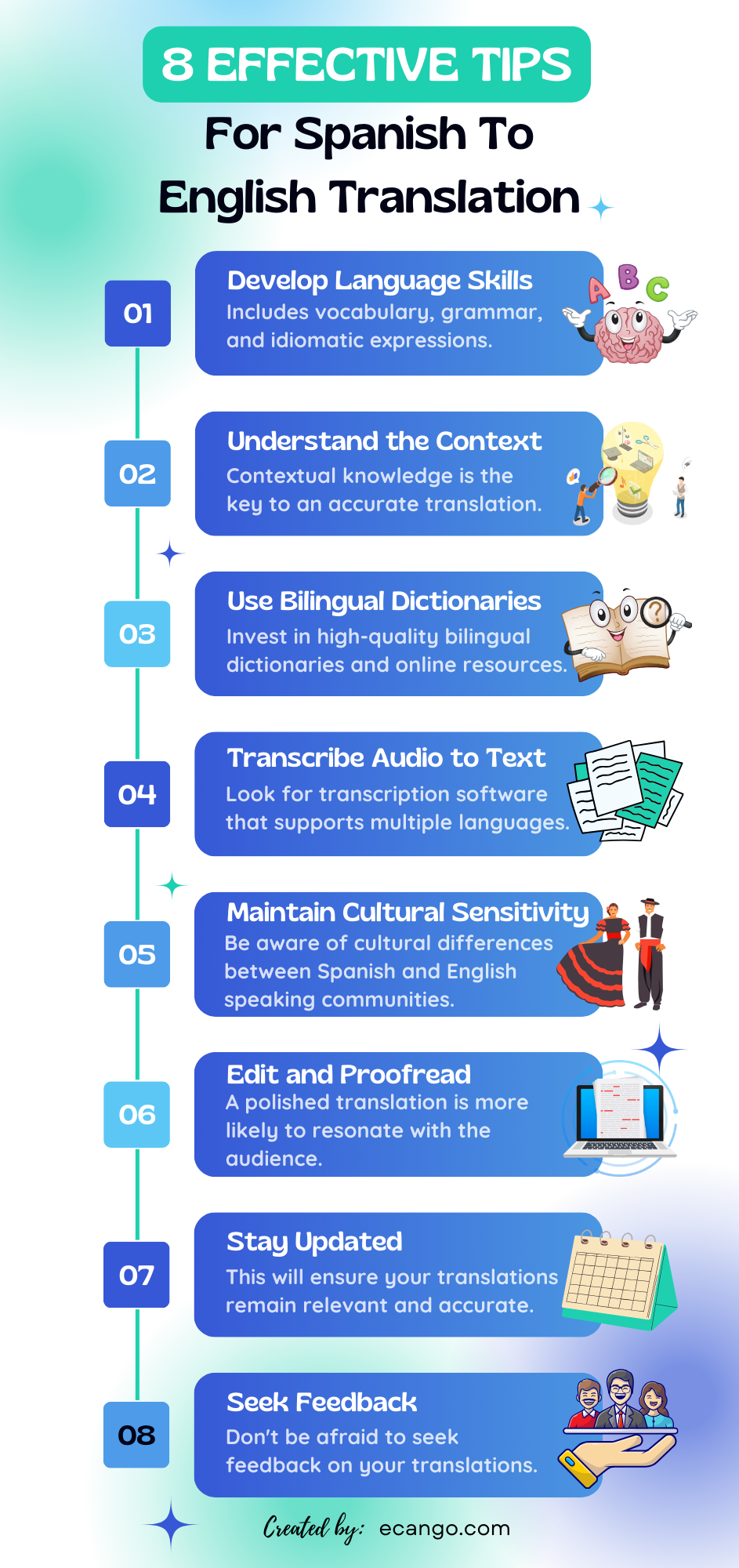 Be aware of cultural differences between Spanish-speaking and English-speaking communities. Understanding these nuances can help you choose the right words and expressions to convey the intended meaning without causing offence.